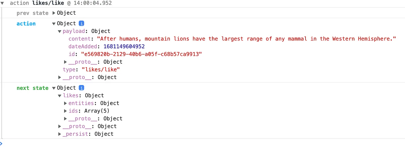 27In your component where the like button is located, you need to dispatch the like action. I created a file at apps/cats/src/app/facts/facts.props.ts: