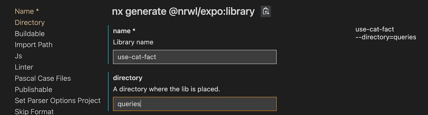 npx nx generate @nx/expo:lib use-cat-fact --directory=queries